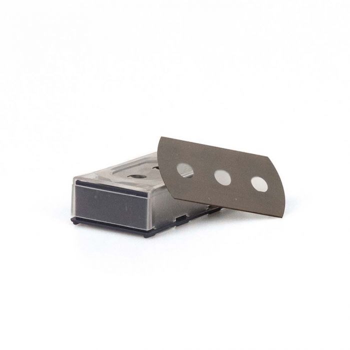 Handig mes met geleider voorzien van teflon om de ondergrond te beschermen. Het mes kan gebruikt worden om alleen de backing of de folie inclusief backing door te snijden.