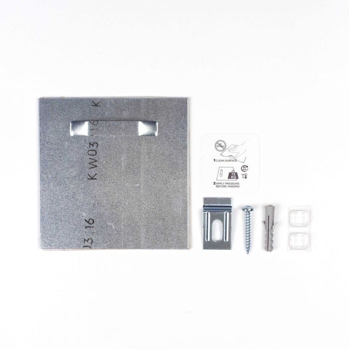 De ophangplaten worden als complete set geleverd, inclusief twee afstandhouders, een muurhaak, een plug en een schroef. Bij de downloads hieronder vind je de montage-instructie, waarin staat hoe je de ophangplaten aan een paneel bevestigd.