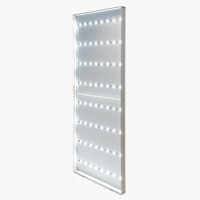 De basis van het LED frame is een robuust (zilverkleurig) aluminium frame met als formaat 85 x 200 cm. Door de dikte van 60 mm en twee voeten is het enkelzijdige frame zeer stevig en kan het vrij staan.