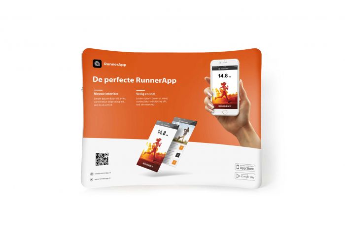 Beurswanden geven een stand een professionele uitstraling. De zipperwand is een gebogen presentatiewand met een print op Dekostof. Vanaf de achterkant is het frame niet zichtbaar en je kunt de wand dus ook dubbelzijdig bedrukken.