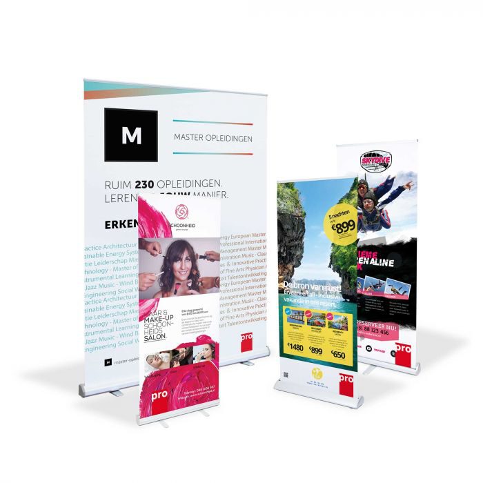 Een roll-up banner kent vele namen: rolbanner, rollup banner of roll banner. Hoe dan ook: hiermee promoot je snel, eenvoudig én voordelig een product, bedrijf of evenement. De roll-up banners kunnen keer op keer gebruikt worden.