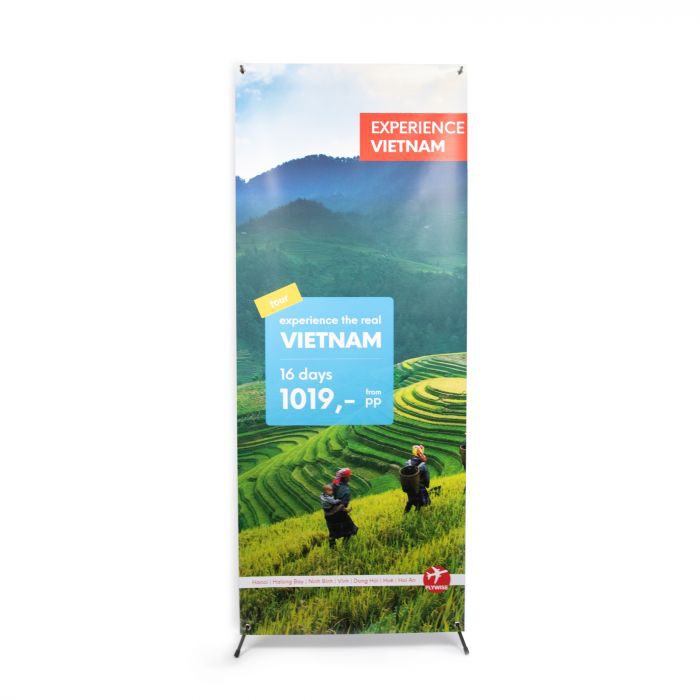 De X-banner is de lichtste banner voor presentaties in ons assortiment. Deze heeft een X-vormige banner standaard. Hierdoor hangt het doek extra strak en kan het tegen een stootje. Je zet deze banners snel binnen op en haalt ze ook weer makkelijk uit elkaar.
