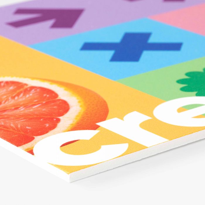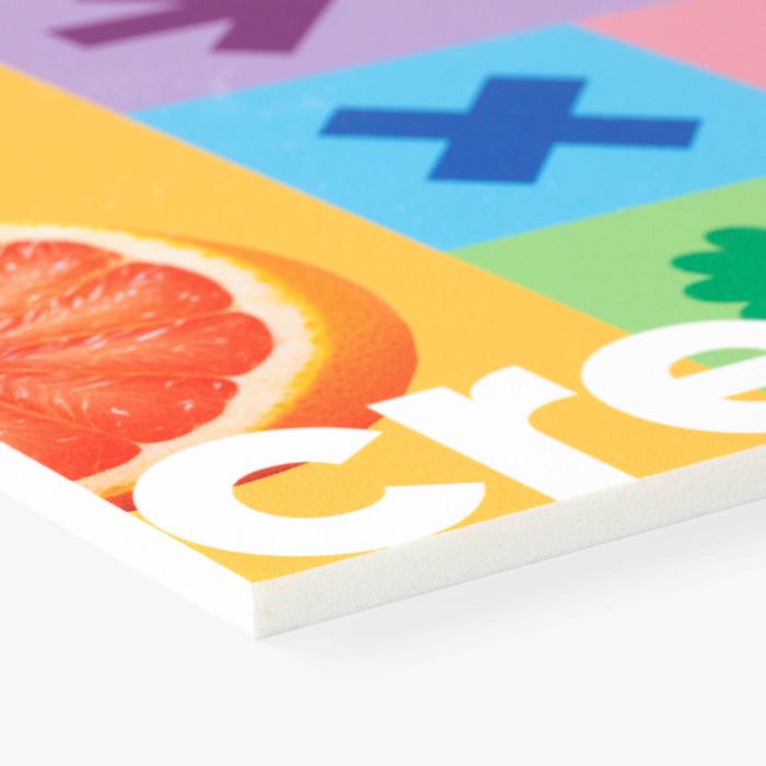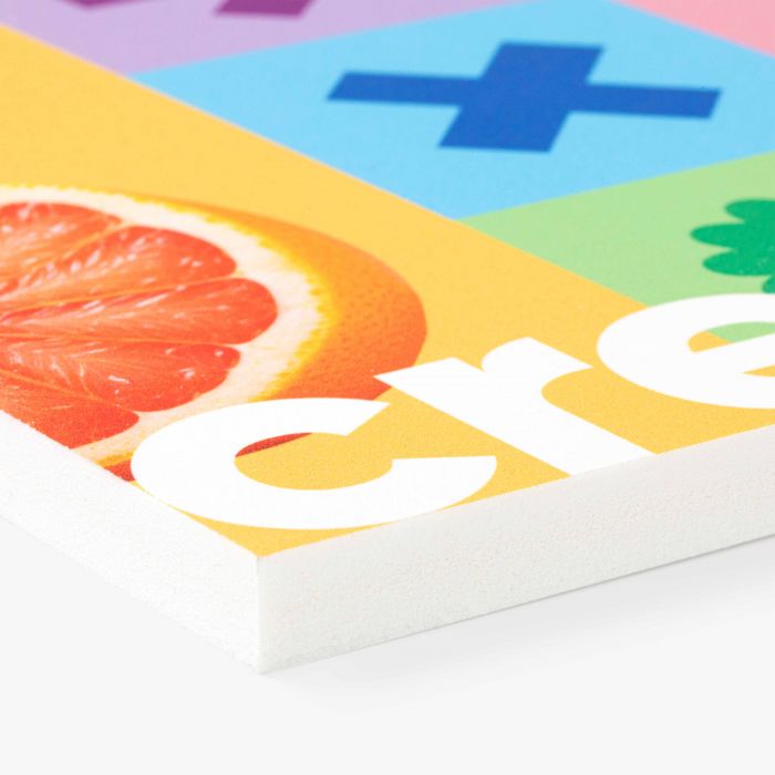 PVC Schuimplaat heeft geen harde toplaag maar een geschuimde toplaag. Goed om te weten: wanneer deze toplaag beschadigt, blijft de inkt intact.
