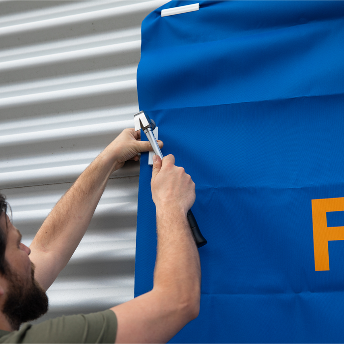 Montagetips Dit klopframe werkt net iets anders dan de andere outdoor frames in ons assortiment. Je begint met het monteren van het frame. Hangt het op de juiste plek? Dan ga je verder met het doek. Deze positioneer je goed en bevestig je met de strips. Deze strips sla je met een rubberen hamer in het frame. Ten slotte snijd je de overige delen, zo’n 7,5 cm van het doek af. Zo hangt jouw doek binnen een mum van tijd strak en netjes in het frame.