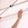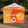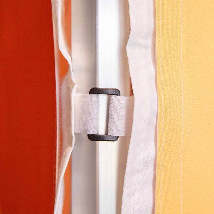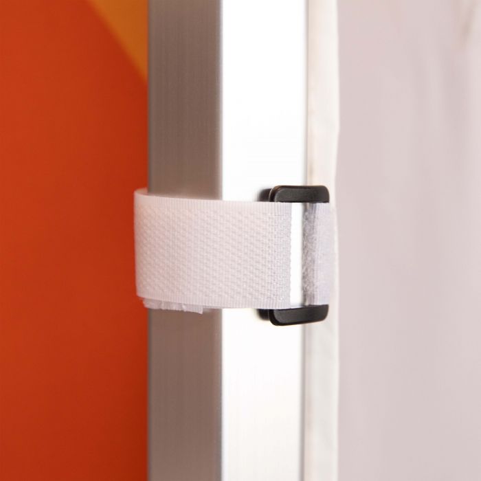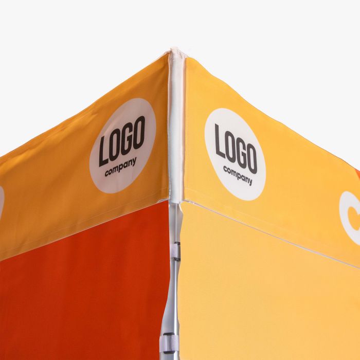 De dakrand is voorzien van klittenband, waardoor je eenvoudig een gepersonaliseerd doek kunt bevestigen. Zo wissel je eenvoudig de print per seizoen, actie of branding zonder dat je een compleet nieuwe tent nodig hebt.