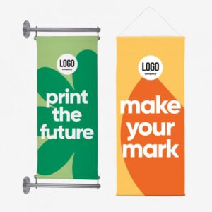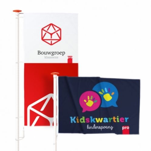 Vlaggen zijn er voor binnen en buiten in twee modellen: een staand en een recht model. We kunnen vlaggen op eigen formaat tot 310 cm breed uit één deel maken. De lengte is hierbij onbeperkt. Wil je nog breder, dan zetten we de delen voor je aan elkaar.